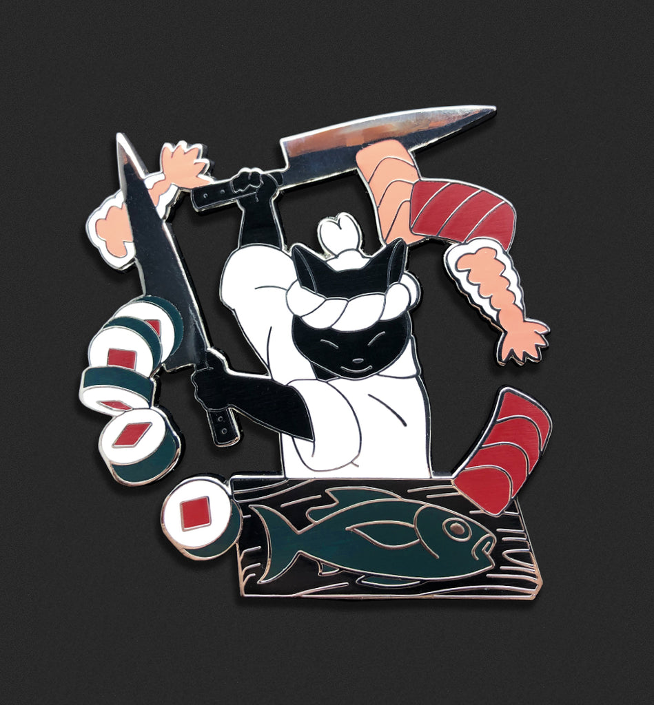 I'm really proud of this design! The sushi looks like it's flying through the air, yet everything is securely attached in a solid pin.