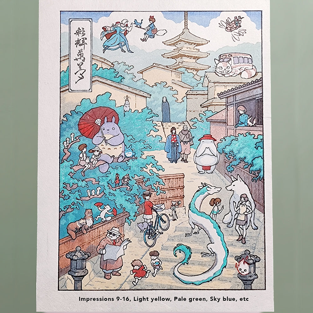 This design requires many individual impressions to achieve a full range of color. Calvin uses the finest quality of yamazakura (mountain cherry) to carve his printing blocks. The wood is capable of holding a very fine level of delicacy – every last detail is printed by the wood left standing, after the rest has been cut away.